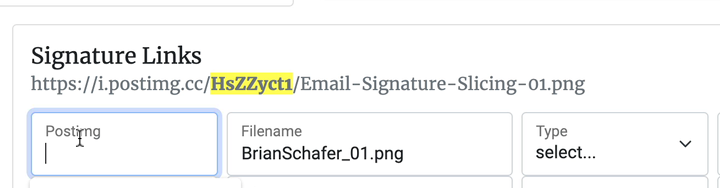 Back on the signature wrangling website, add the code for the filename in the 'Postimg' box.