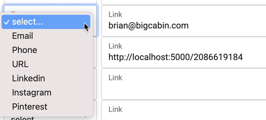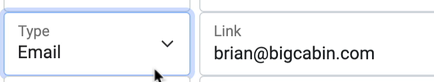 You can enter the link exactly as you want, or use the 'Type' drop down to choose the right prefix. For an email you would choose email and enter just the email address. For social media links, just enter the profile part of the link.